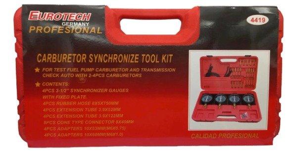 El kit de manómetros para sincronizar carburadores permite trabajar simultáneamente con 4 carburadores en motores de nafta. Su uso es muy amplio, ya que permite ajustarlos y reprogramarlos, conocer el estado del motor y detectar fallas (distribuciones mal ajustadas), colectores en mal estado u obstruidos, fugas en la culata, muelles de válvulas flojos o mal montados, retrasos o problemas en el sistema de encendido.